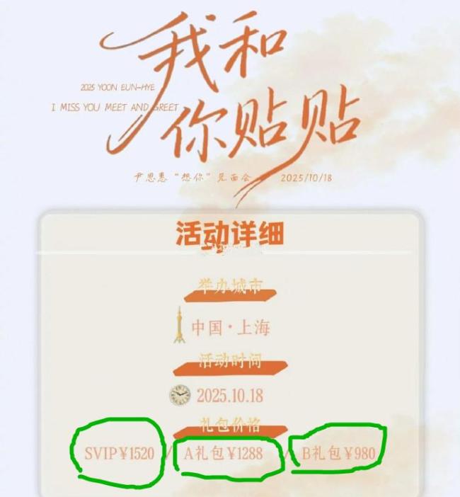 近日,韩国女明星尹恩惠在上海的粉丝见面会开票了。SVIP票价为1520元,A礼包1288元,B礼包980元。消息一出,立刻引发广泛讨论